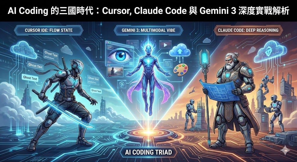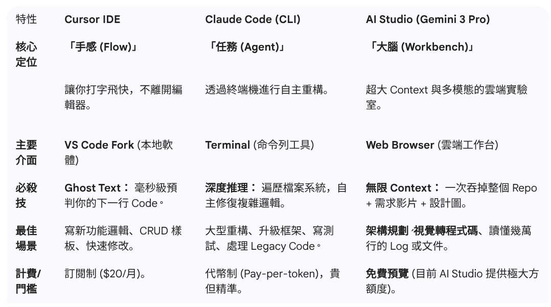 AI Coding 的三國時代:Cursor IDE, Claude Code 與 AI Studio (Gemini 3) 實戰解析 by 2025/12